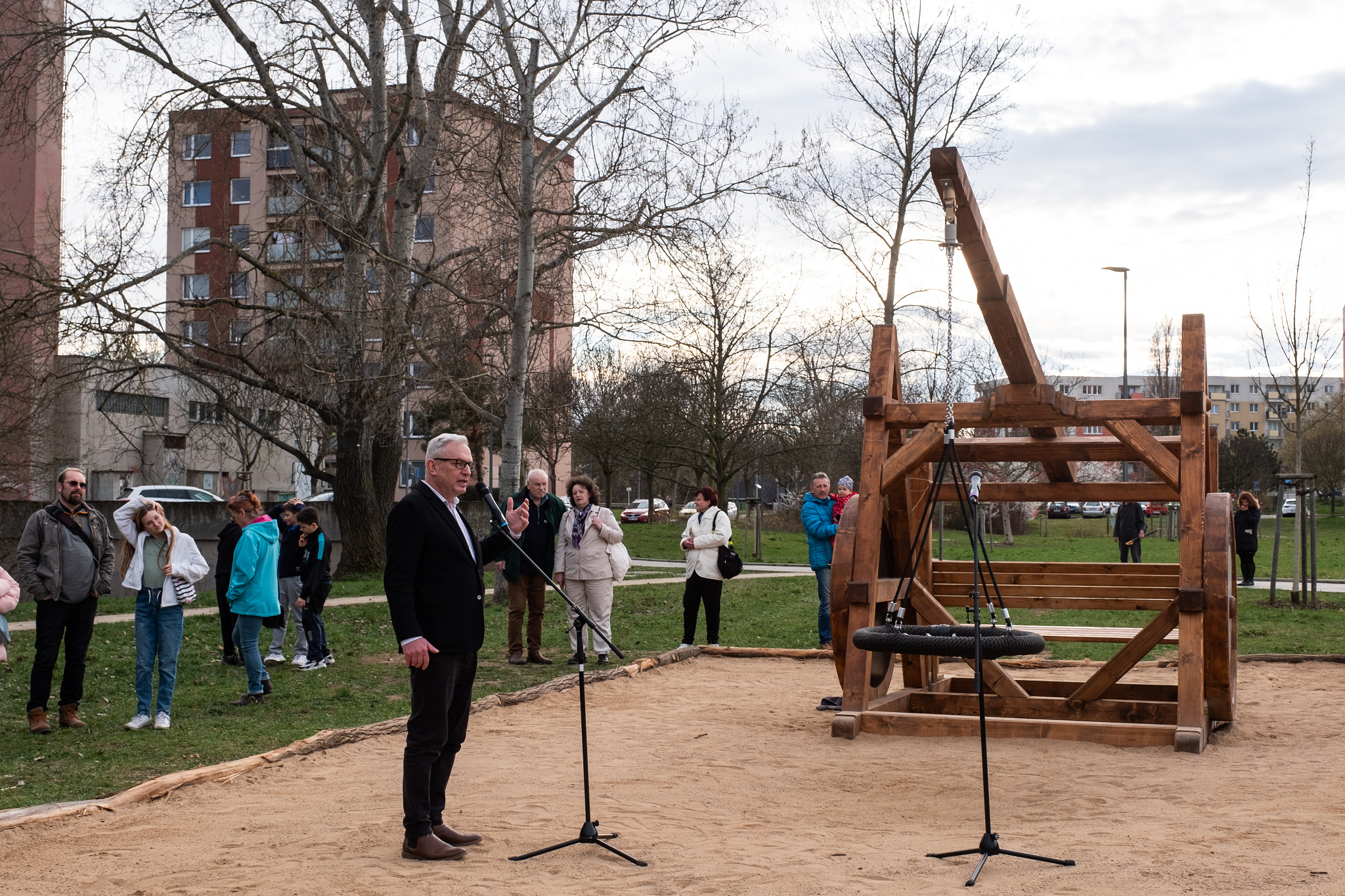 Prak ve formě dětského hřiště byl postaven v Central parku a namířen na Čakovice. Po jeho stranách jsou dvě kola nesoucí názvy her Divadla Járy Cimrmana a konstrukce je převážně ze dřeva. Realizace zahrnovala ukotvení, výrobu praku včetně houpačky a vypálení názvů her do kol.